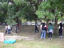 また、秘密基地企画のプレ企画として会場で学生スタッフにロープとネットとラワン合板を竹とともに用いて秘密基地を制作しました。