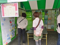 また、千の種あかし隊のブースでは、千種の魅力NAGE(仲田商店街夏まつりの際に行ったものと同じ)を行い、行列が出来るほど大盛況でした!(左・中) 待ち時間には、千の種かるたの採用作品一覧と絵札部門全応募作品の展示を行い、受賞者の発表もしました。(右)
